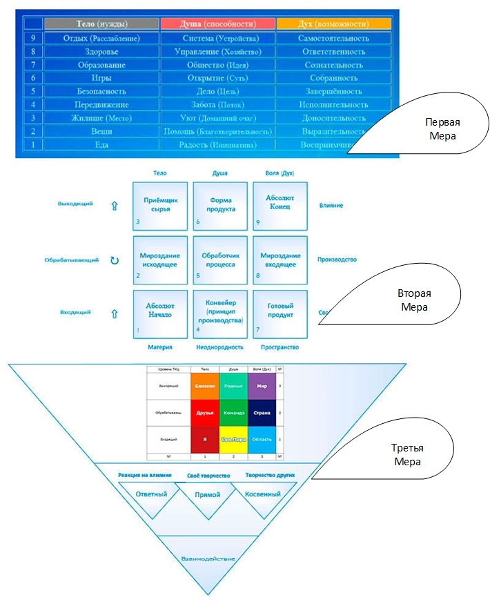 2 мера ТКЦ позволяет взять ценность, которую мы определили перед этим, и запустить как сырьё в наш производственный душевный «завод». А глубина 2 меры Карты Ценностей позволяет зайти в определённый «цех» по производству счастья и сделать в нём производство ценности. 3 мера ТКЦ помогает нам определить ту сферу, на которую непосредственно влияет наше сделанное производство, а после – произвести это влияние.