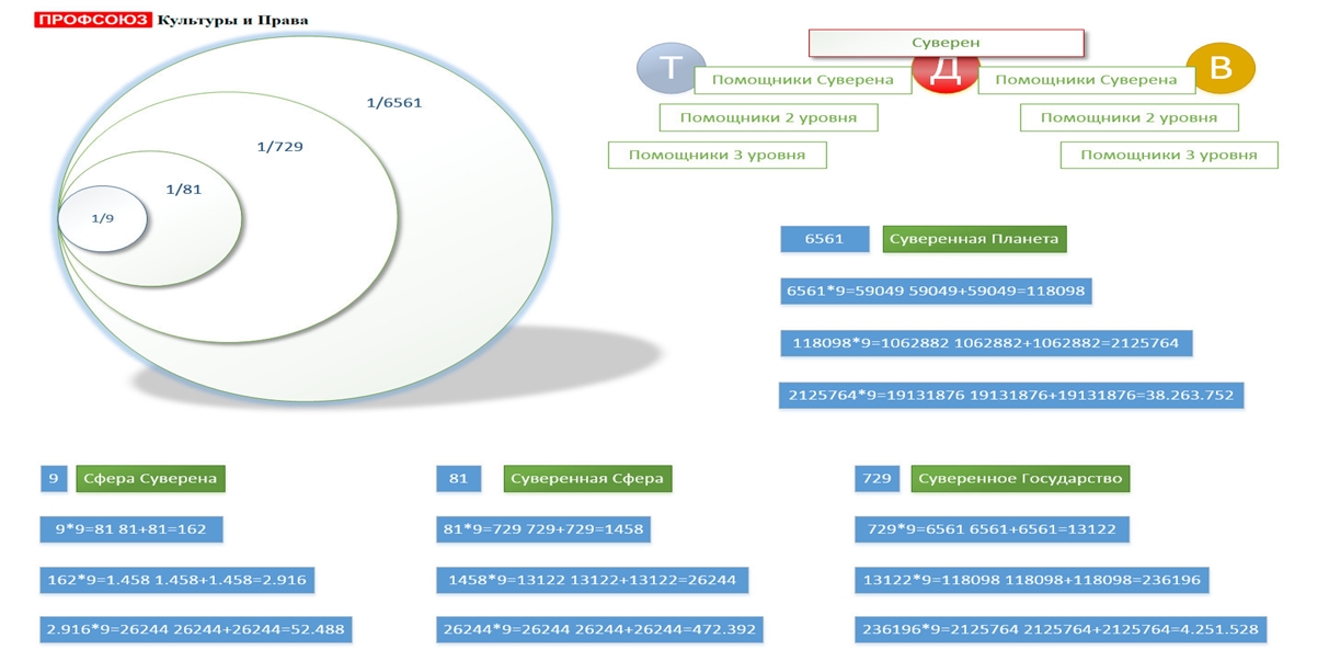 1 Команда состоит из 9 Суверенов и выстраивает Сферу Суверена. 9 Команд состоит из 81 Суверена, которые строят Суверенную Сферу. 81 Команда состоит из 729 Суверенов, строит Суверенное Государство (Ниша). 3-17 Суверенных Ниш – Суверенная Страна , из них выстраивается Суверенный Мир или Суверенная Планета.
