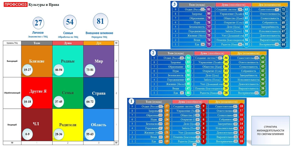 Первые 27 лет мы все проходим знакомство с теми ценностями, которые сменяют друг друга каждый год (личное), до 54 лет проходим обработку в жизненных ситуациях, через которую необходимо, чтобы у нас было своё душевное производство (семья или Команда), а до 81 года нам уже нужно уметь передавать молодому поколению то производство, что мы запустили в предыдущие 27 лет своей жизни (передача ТКЦ).